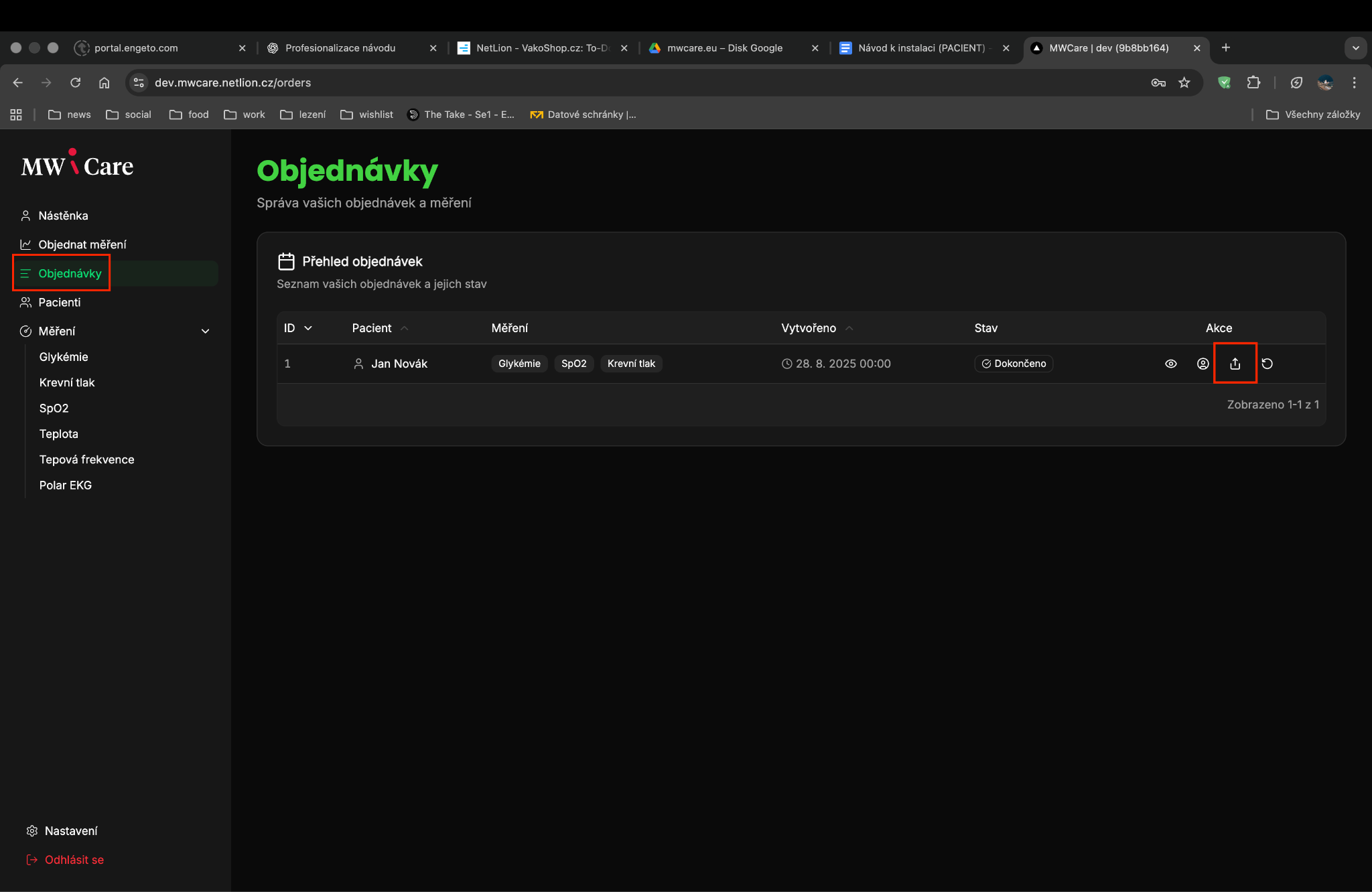 • Pacient zde vidí všechna svá měření a přehled objednávek