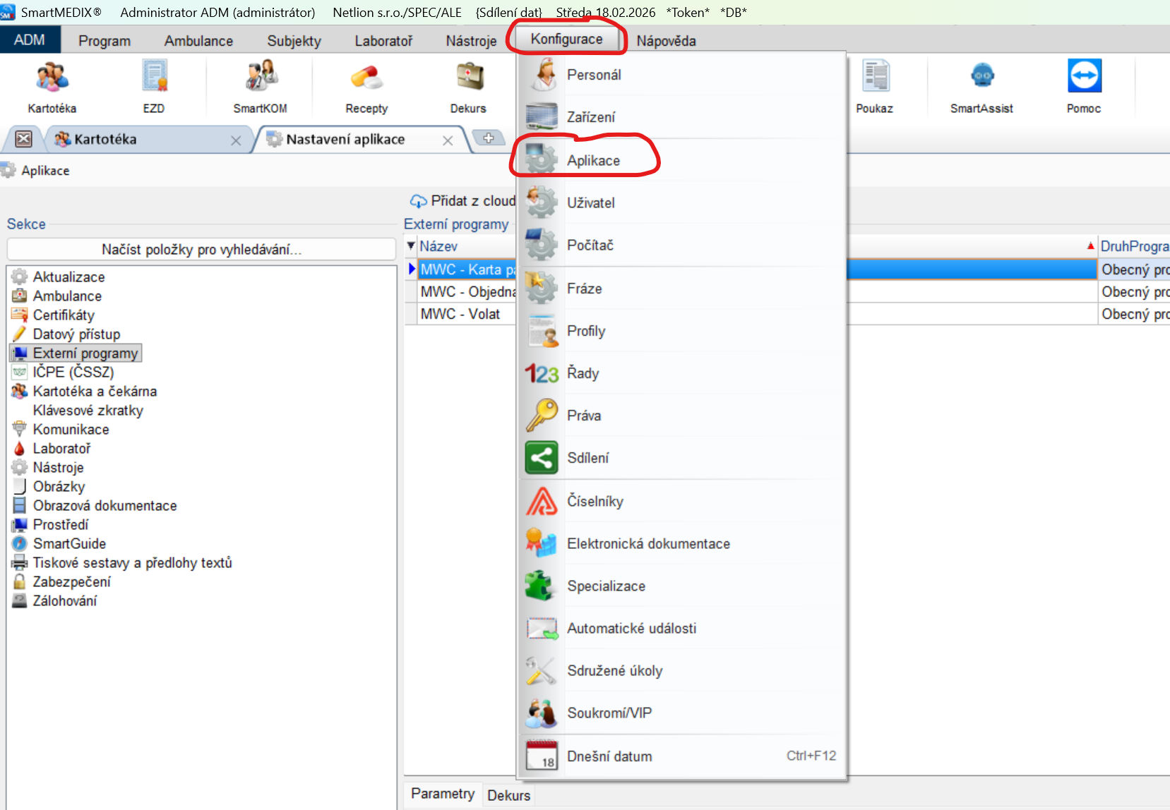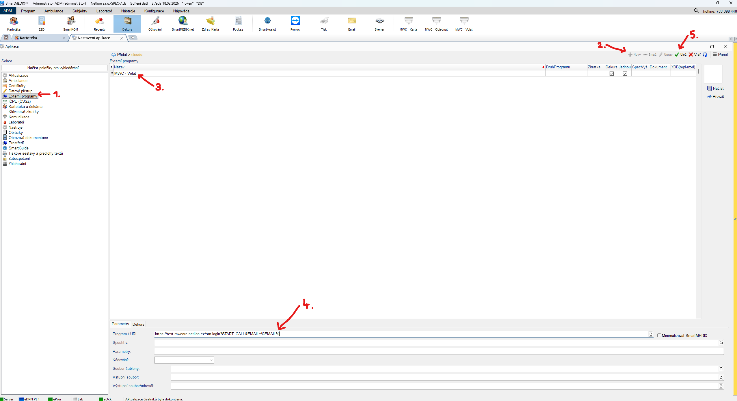 4. Přidejte nový externí program MWC karta pacienta